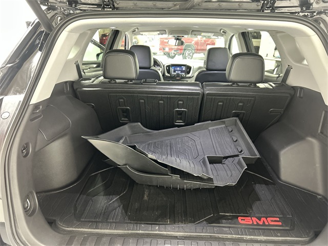 Safety features include GMC Pro Safety Plus, lane change alert with side blind zone alert, rear cross traffic alert, rear park assist, the safety alert seat, and fully automatic headlights with auto high beam. The Terrain SLT also comes with a power liftgate, integrated cargo liner, all weather floor liners, silver painted 18 inch aluminum wheels, and front and rear all weather floor liners.